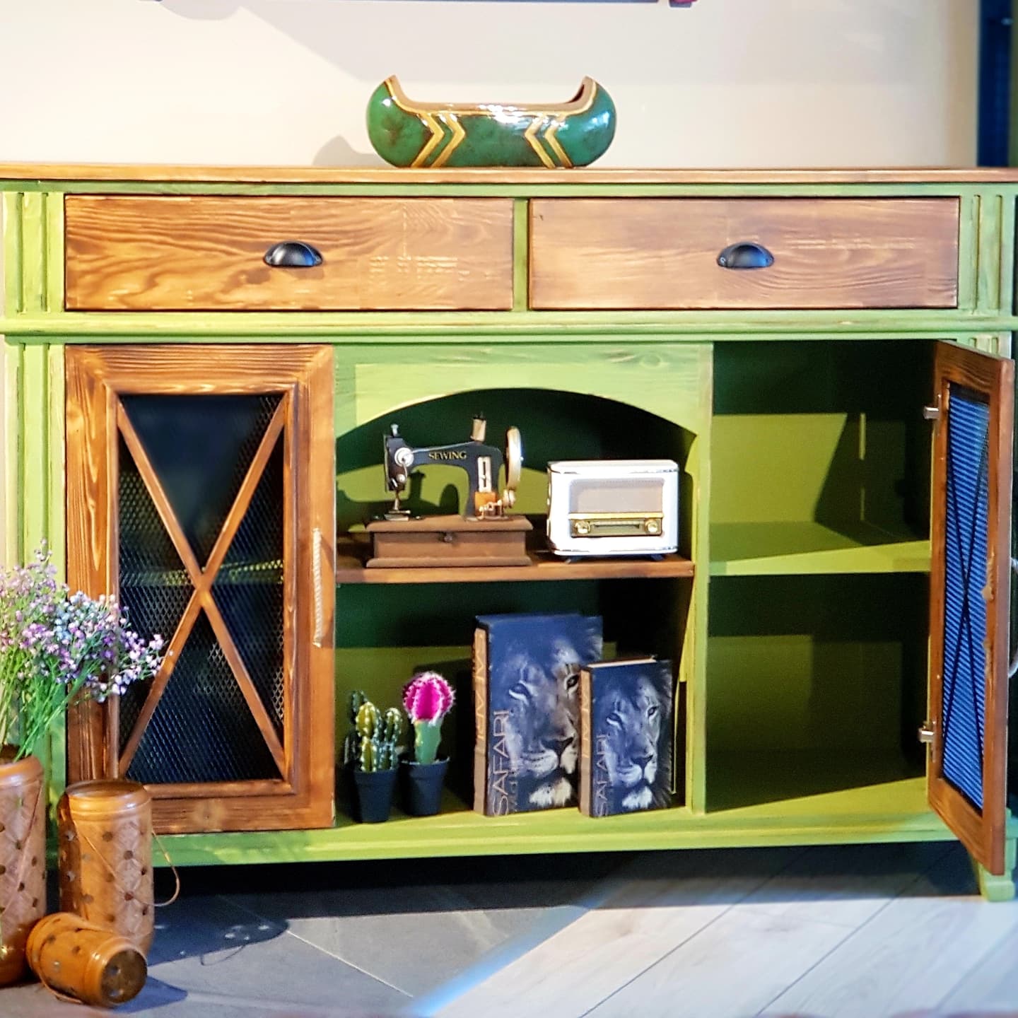 Tamamı fırınlanmış ve eskitilmiş masif ahşaptan üretilmiştir. %100 el işçiliği el boyaması üründür. Kapaklarda tel kullanılmıştır.