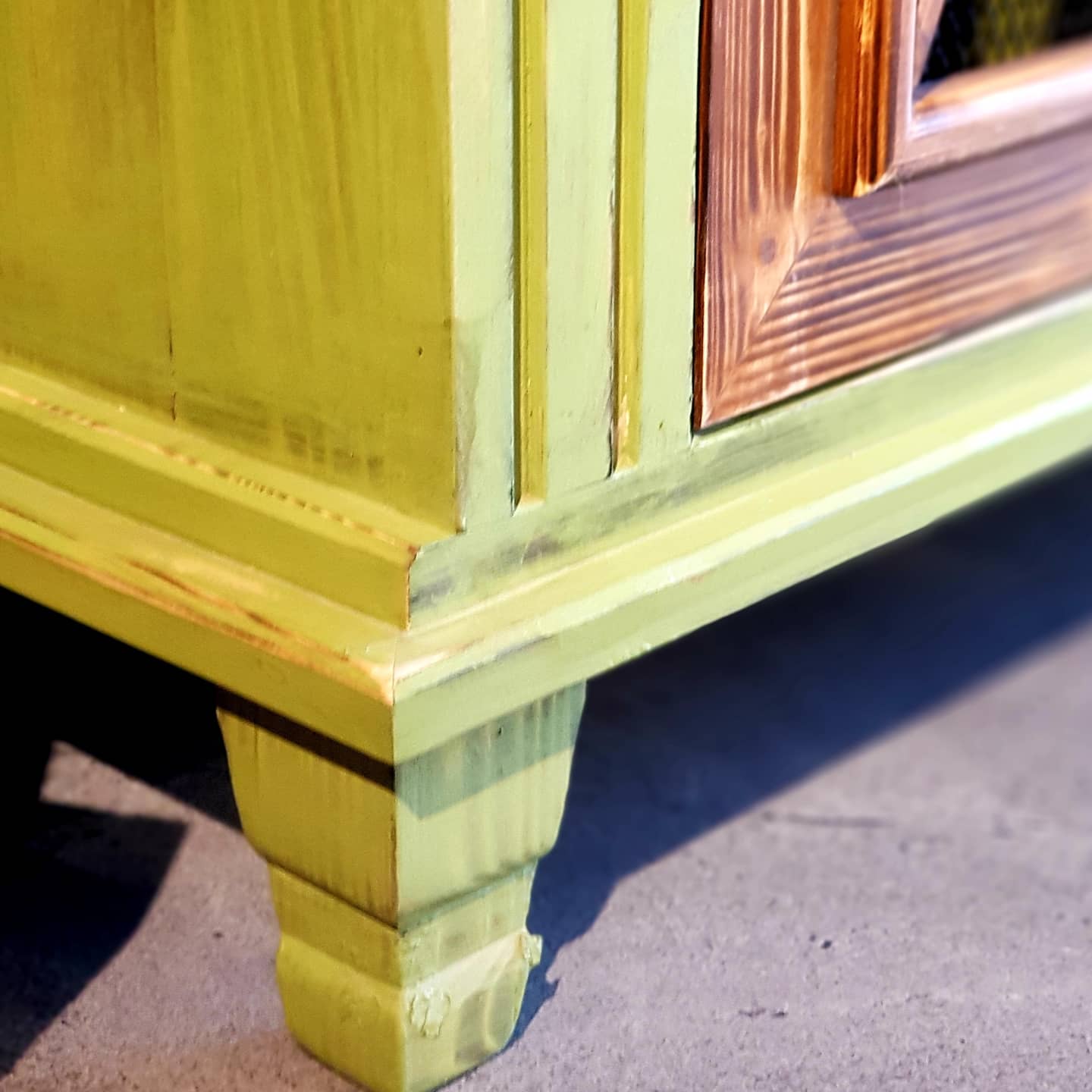 Su bazlı boya ile renklendirilmiş olup eskitme işlemi ve koruyucu vernik uygulanmıştır