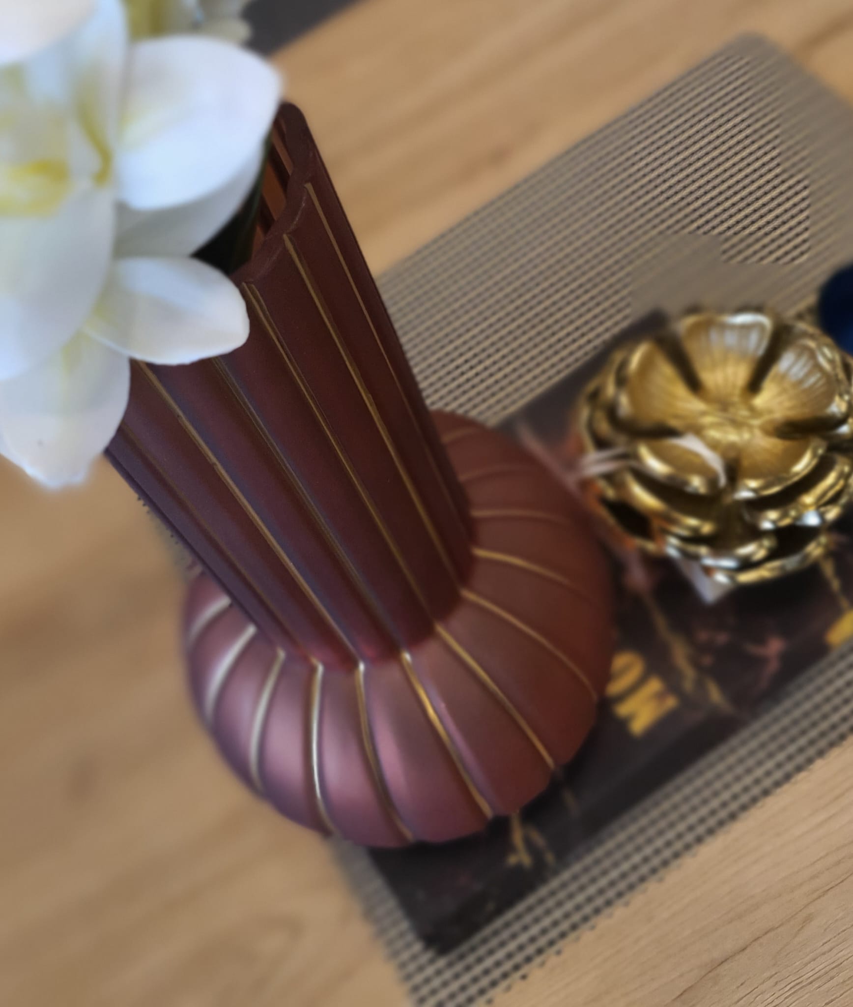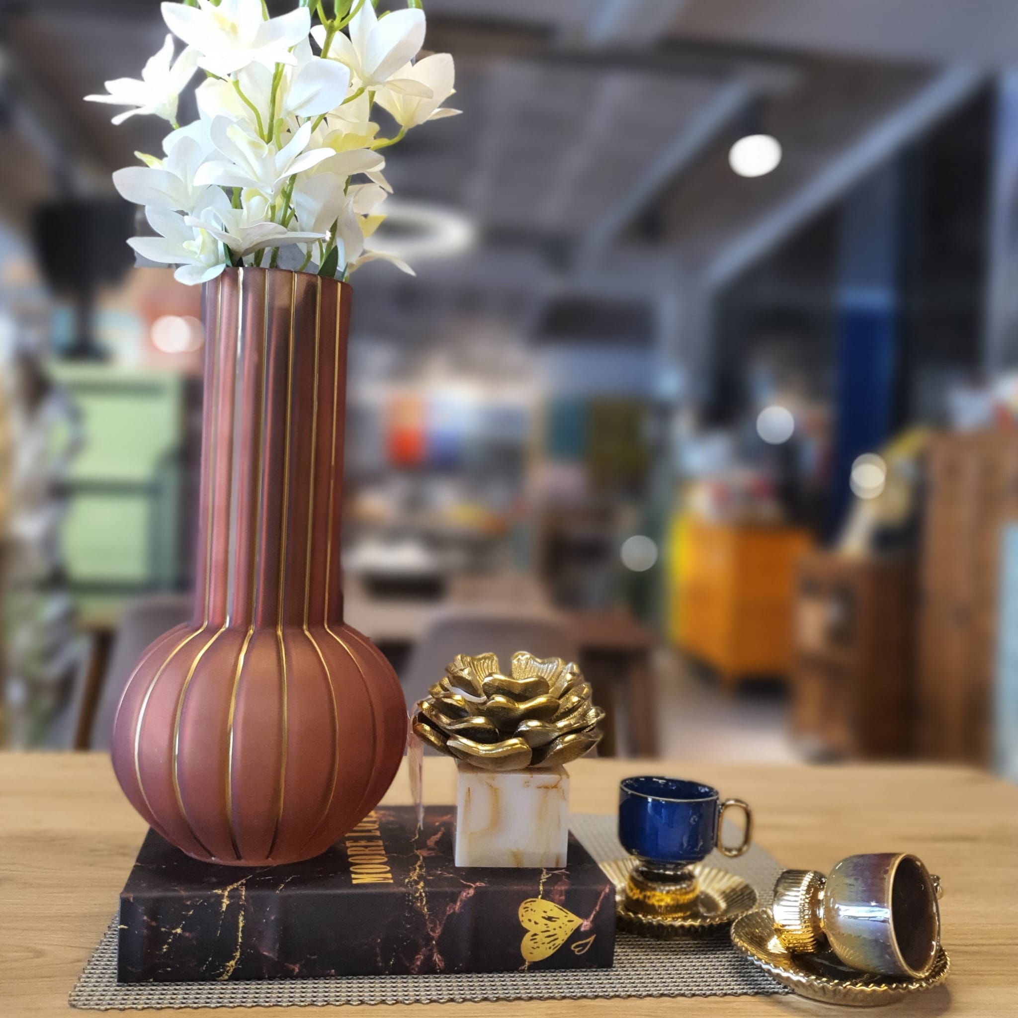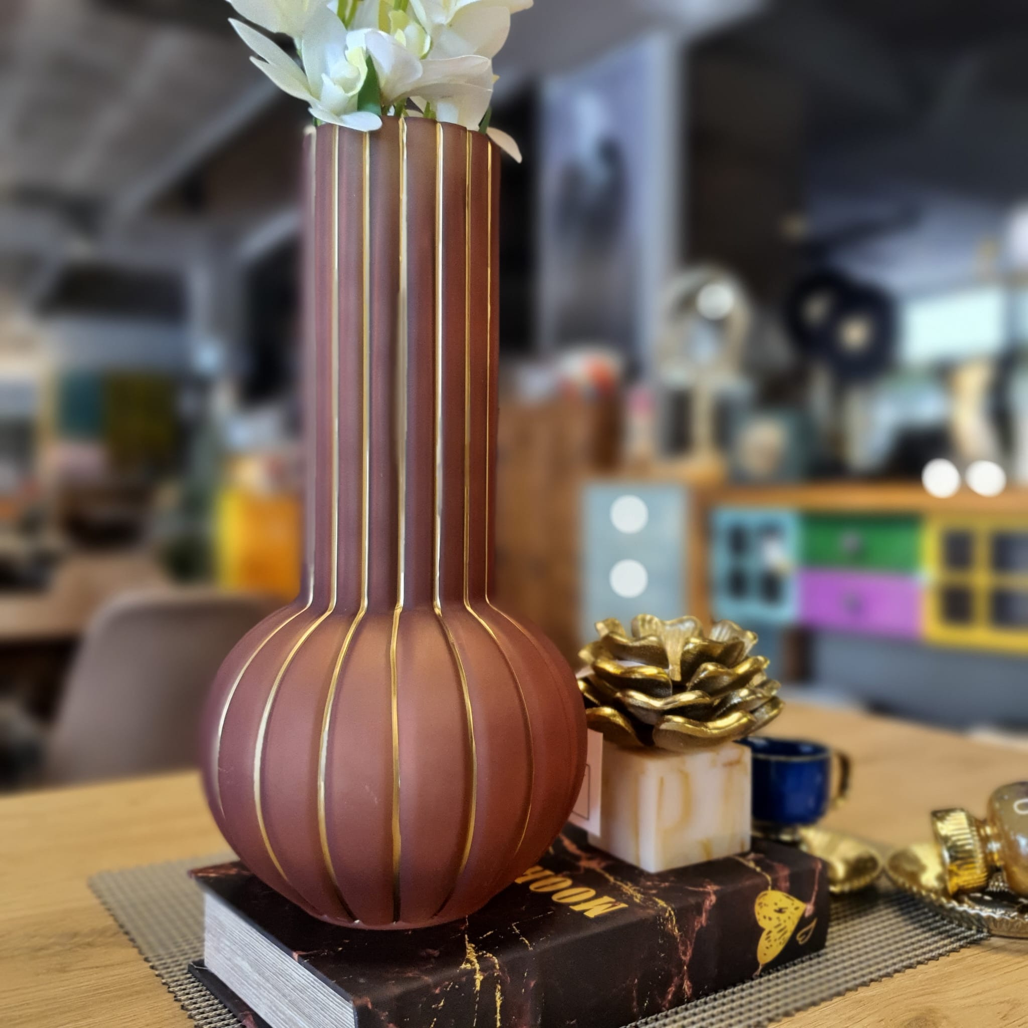 Bakır renk cam vazomuz kabak model görünümü ile oldukça şık ve zarif bir görünüme sahiptir. Belirgin altın renginde ki çizgi detaylar göz alıcı görünümü ön plana çıkarmaktadır. Renklerin birbirleri ile olan muhteşem uyumu vazomuzu sade bir dekorasyon ürünü olarak kullanmanıza da yardımcı olacaktır.