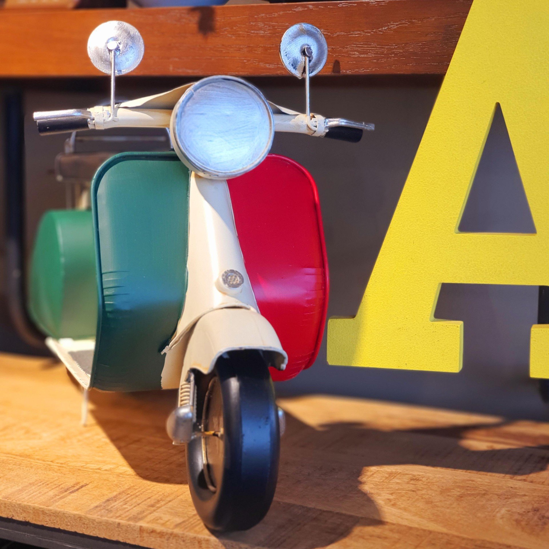Metal dekoratif scooter modelidir. Vintage tasarım olup tamamı metal malzemeden el yapımı ve el boyaması olarak üretilmiştir. Eskitme işlemi uygulanmıştır. Koleksiyon severlerin oldukça dikkatini çeken ürünümüz dekoratif olarak sizler için hazırlanmıştır. Oyuncak değildir.