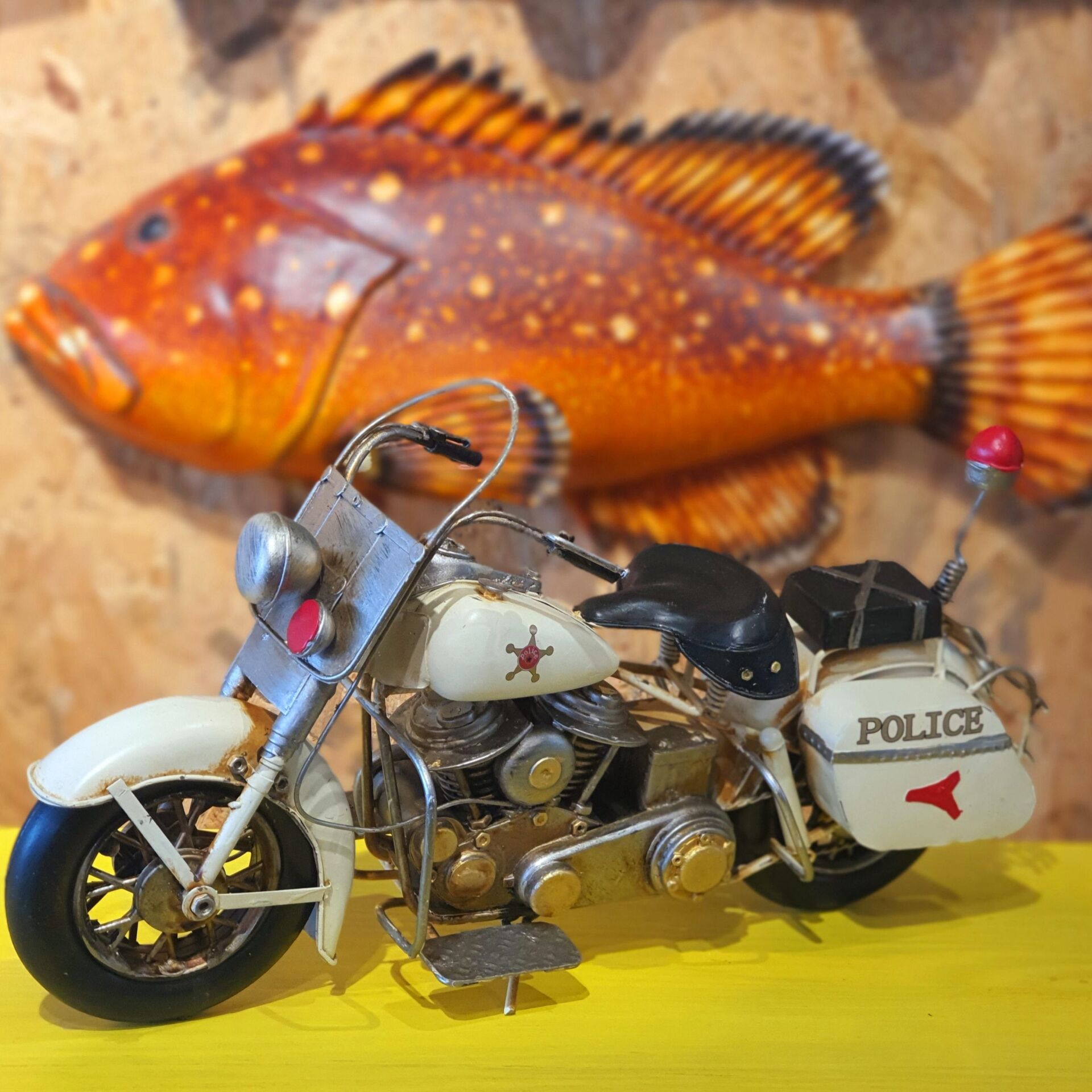 Nostaljik motosiklet modeli olup tamamı metal malzemeden el yapımı ve el boyaması olarak hazırlanmıştır. Eskitme işlemi uygulanmıştır. Oyuncak değildir dekorasyon ürünüdür. Motor severlerin tercihi olarak koleksiyonlarına ekleyebilecekleri özel tasarım ürün modelidir.