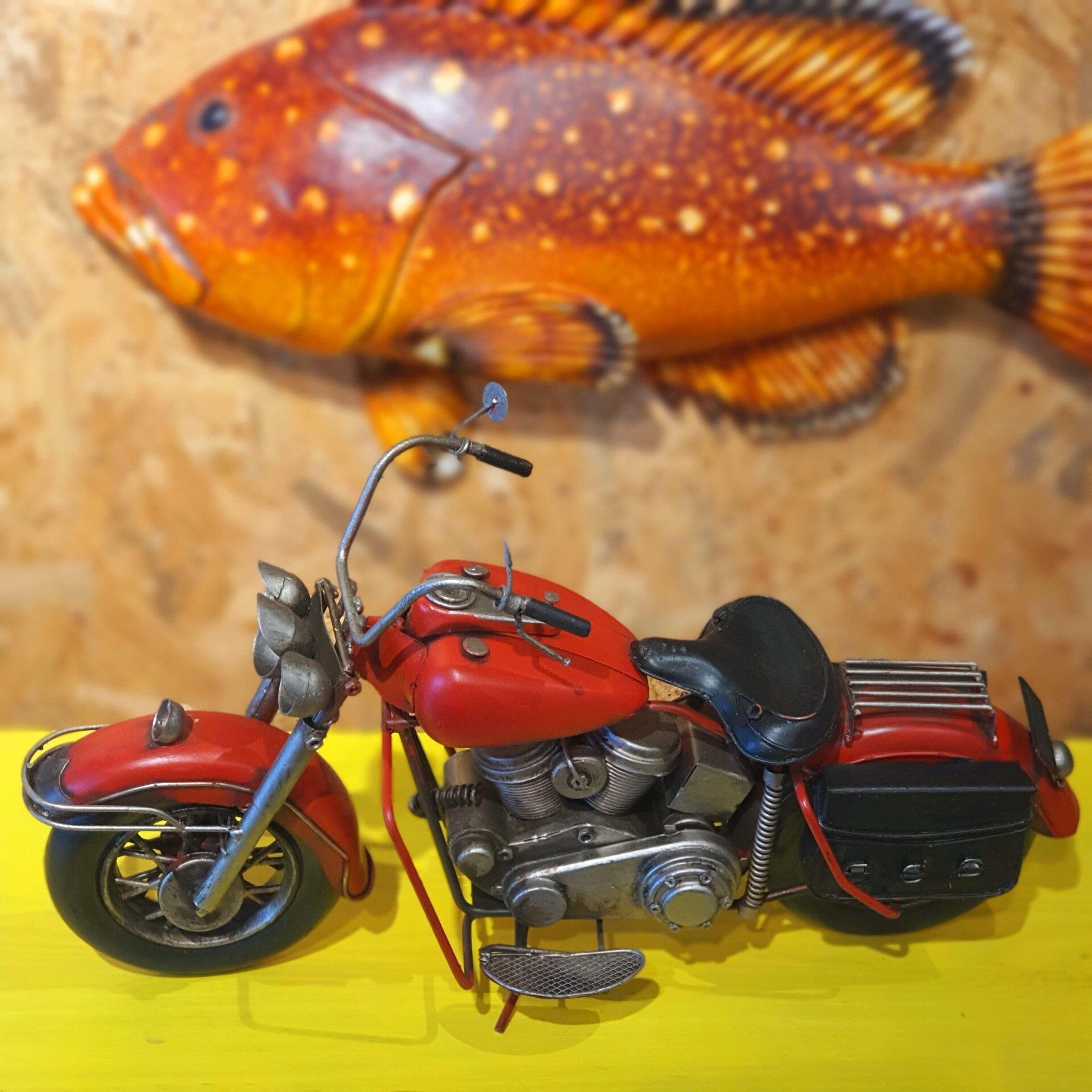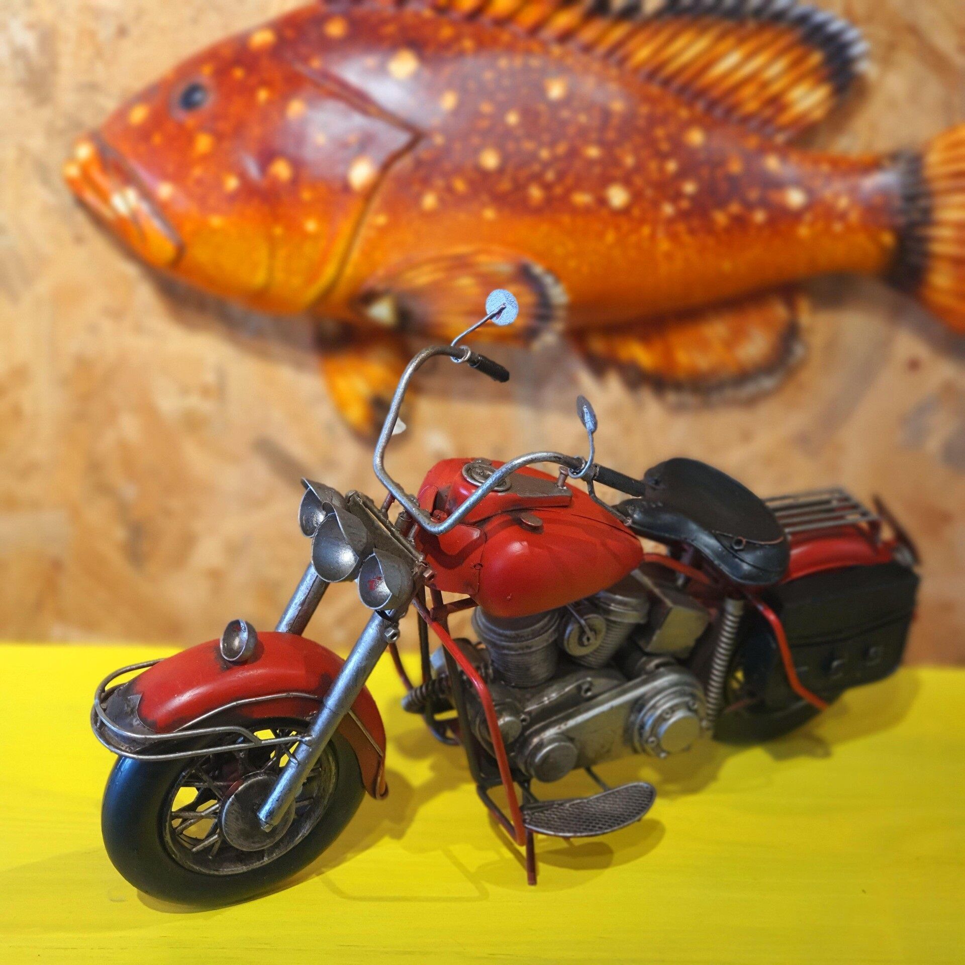 Chopper motosiklet modeli olup tamamı metal malzemeden el yapımı ve el boyaması olarak hazırlanmıştır. Eskitme işlemi uygulanmıştır. Oyuncak değildir dekorasyon ürünüdür. Motor severlerin tercihi olarak koleksiyonlarına ekleyebilecekleri özel tasarım ürün modelidir.