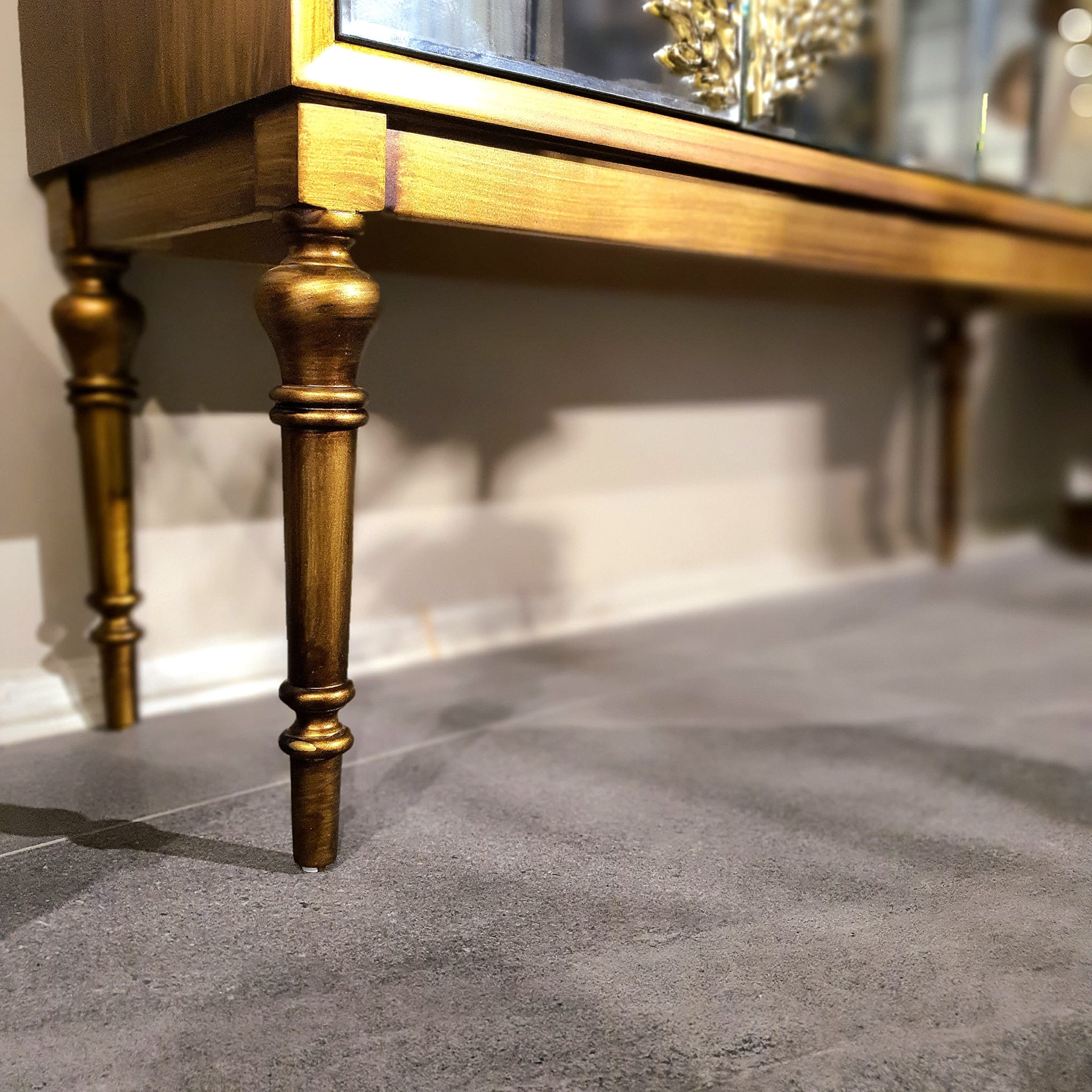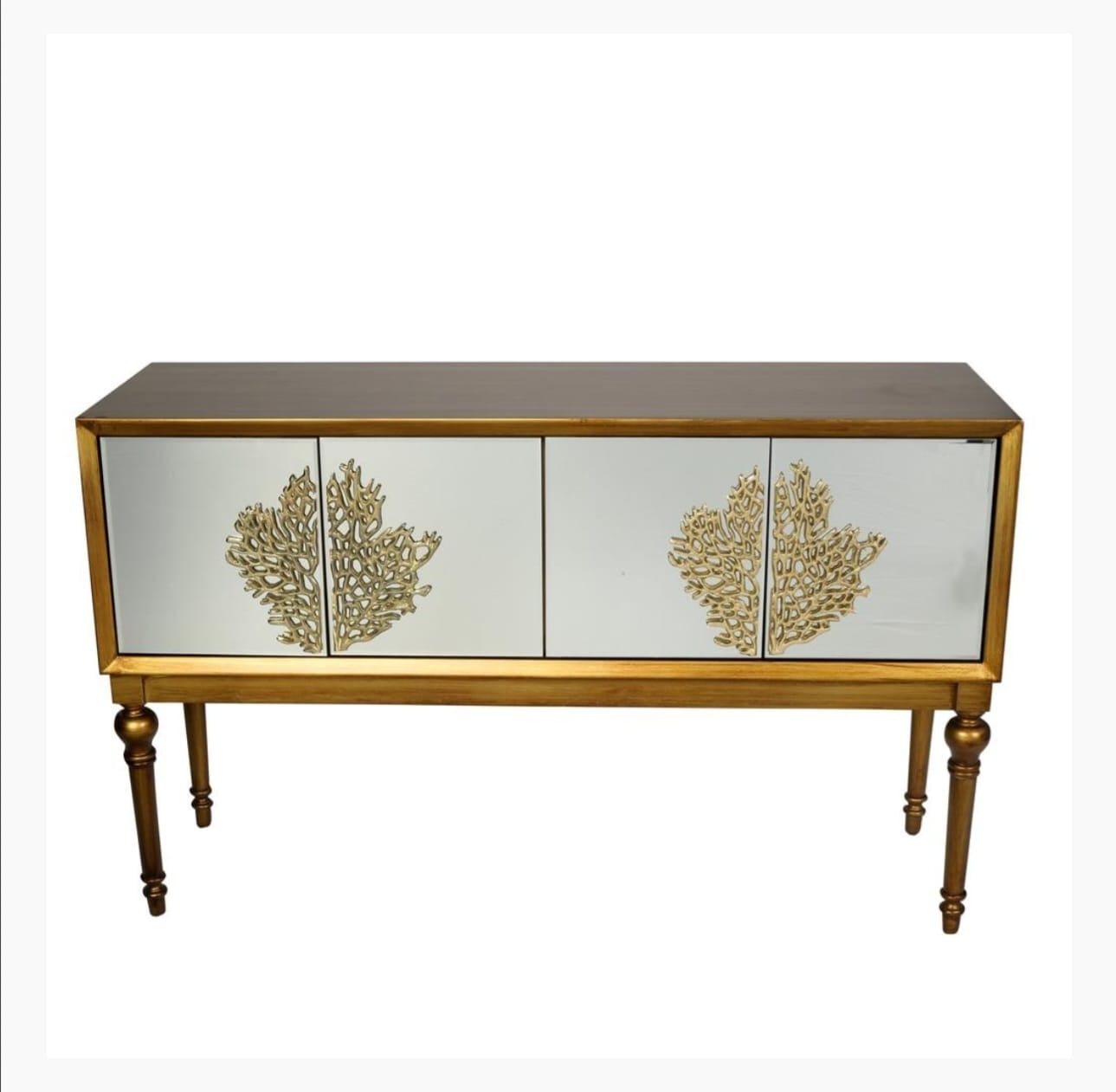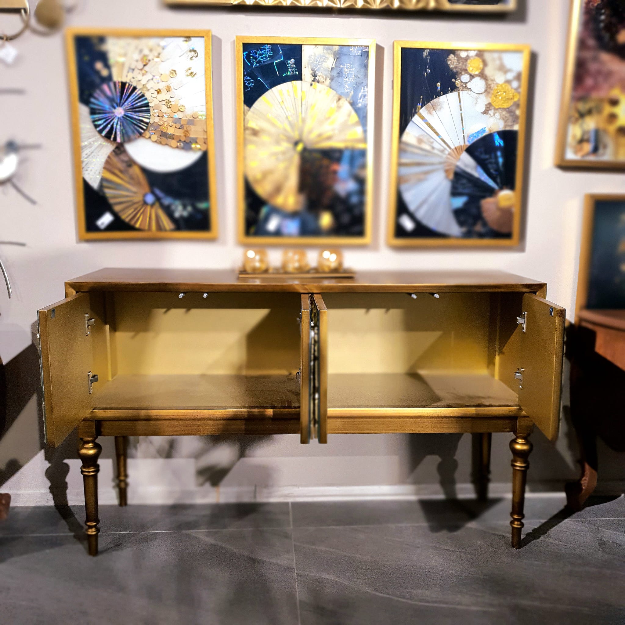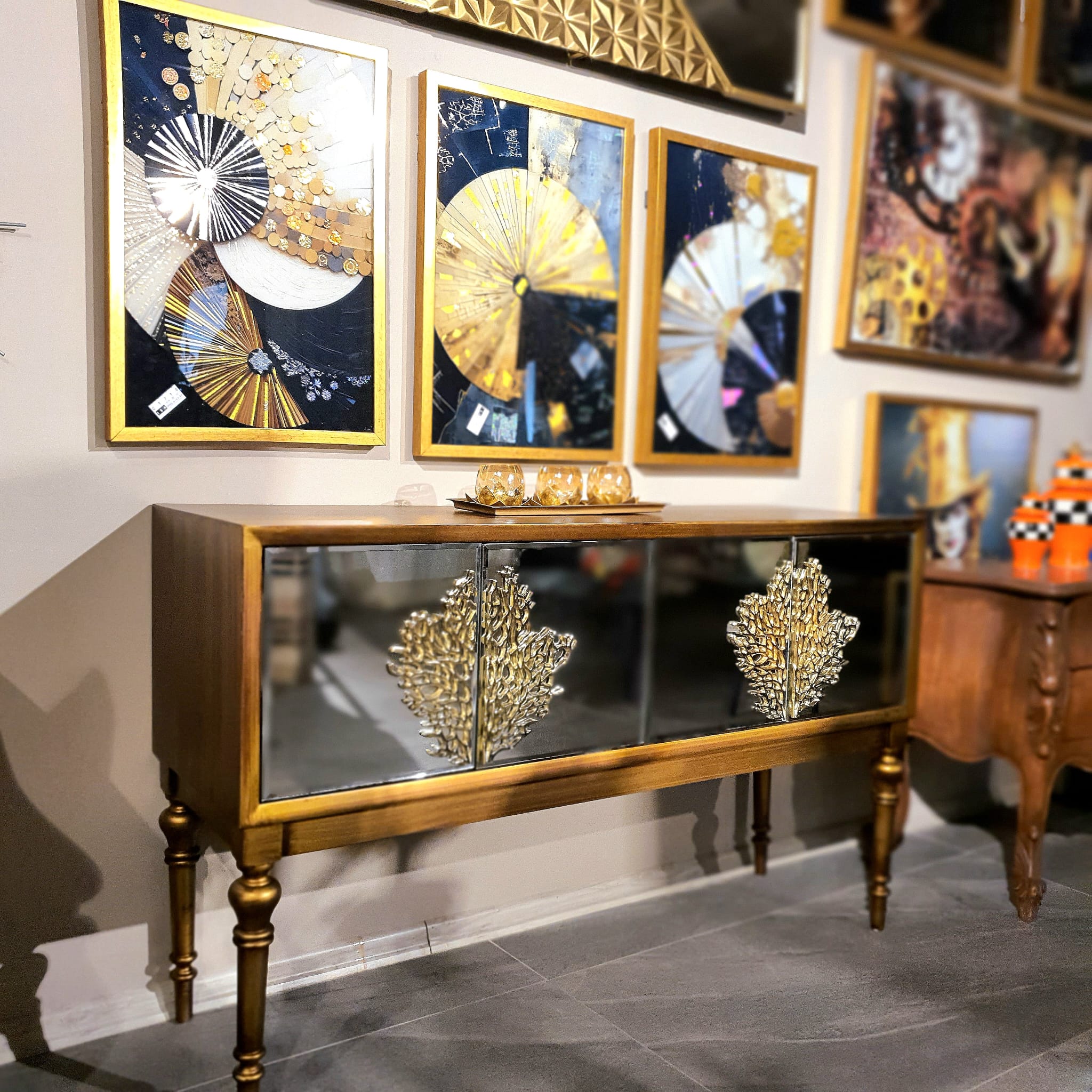 Ev dekorasyonunuzu şık ve zarif bir şekilde tamamlamak için tasarlanmış yüksek kaliteli malzemelerden üretilmiş olan konsolumuz dayanıklı yapısı ile sizlere uzun ömürlü kullanım sağlar. Gold renkli yüzeyi yaşam alanlarınıza sıcaklık ve lüks bir hava katarak, dikkat çekici bir görünüm elde etmenizi sağlar. Modern ve klasik tasarımın mükemmel bir kombinasyonu geniş tasarımı sayesinde, eşyalarınızı düzenli bir şekilde sergileme imkanı verir.