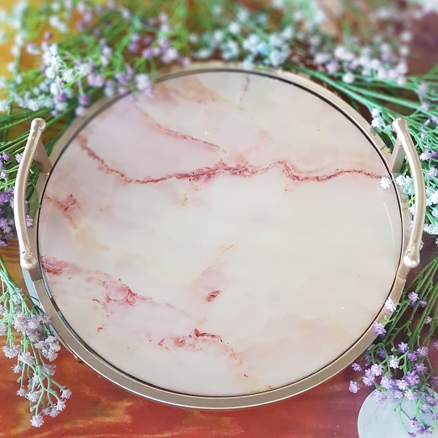 Eskitme metal gövdeli,mermer görünümlü pleksi tabanlı tepsi