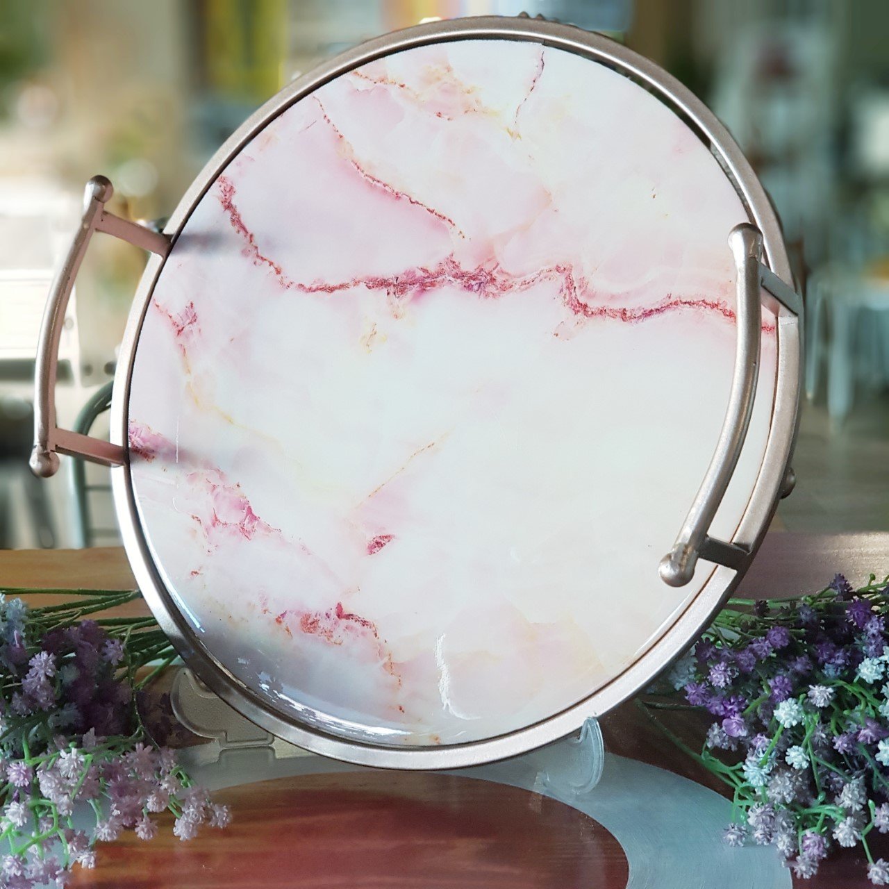 Mermer Desenli Kulplu Yuvarlak Tepsi